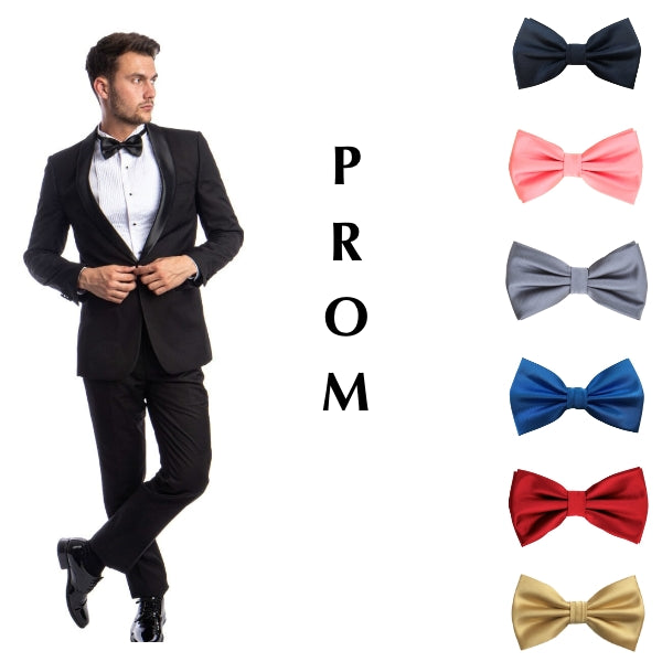 - Choose from a variety of bowties or ties in colors such as black, pink, silver, royal blue, red, or gold to complete your look