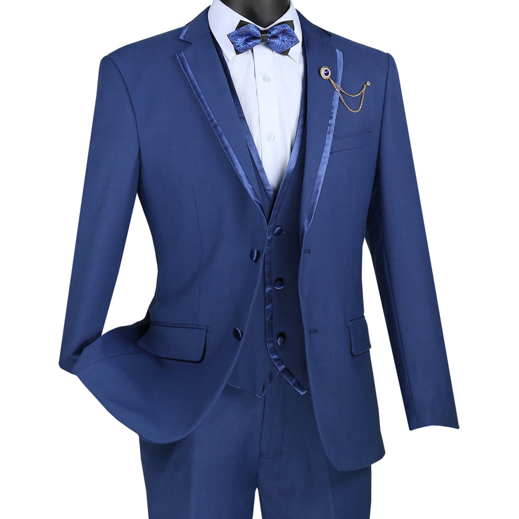 The jacket features a notch lapel with satin lining in royal blue color, one button closure, side vents and it has two front pockets and one chest pocket for your essentials. The pants are plain front and made to match the jacket with a slim fit, providing a coordinated look. The vest is made to match the jacket, with satan trim and fully lined.