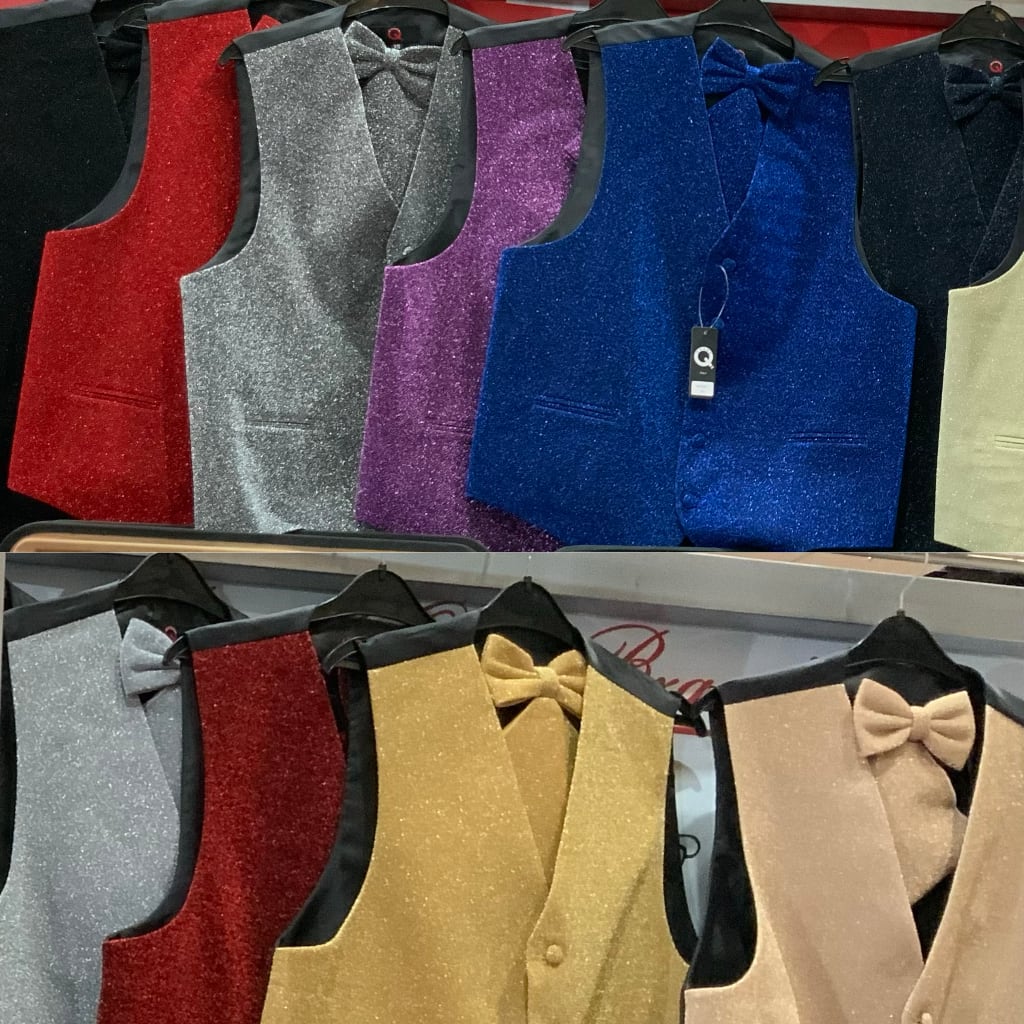 Sparkle Vest and Bowtie. Full back, six buttons adjustable vest with matching tie or bowtie, comes with the matching pocket square. The lining and back of the vest are black.